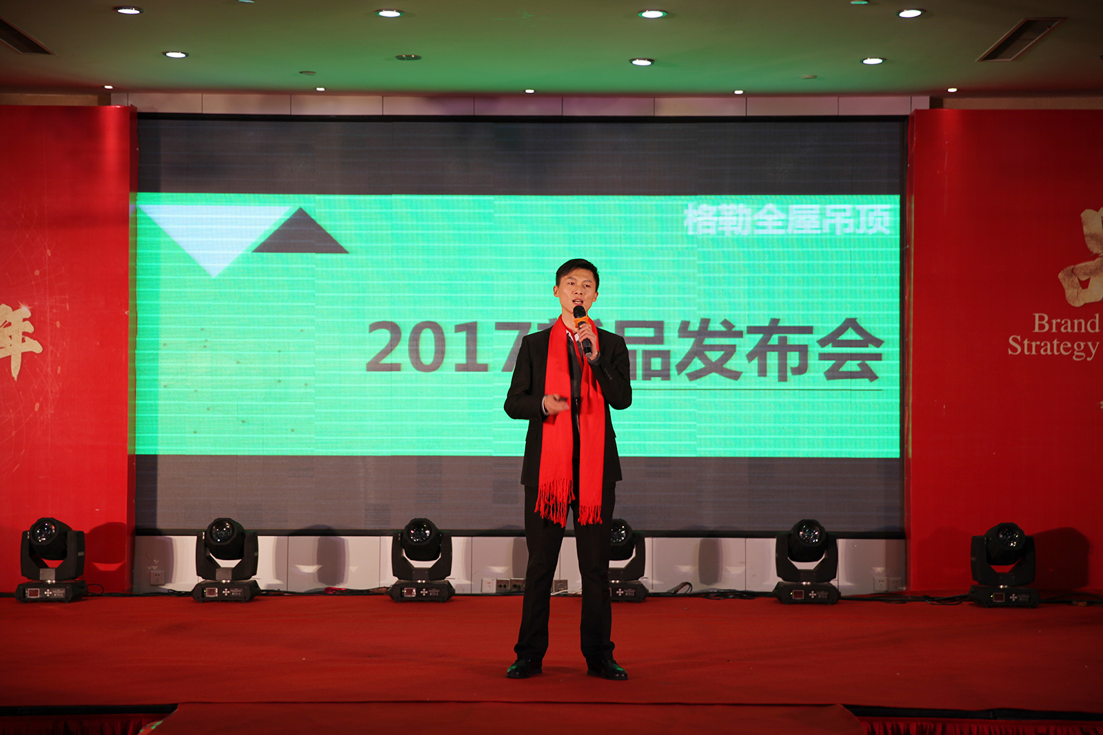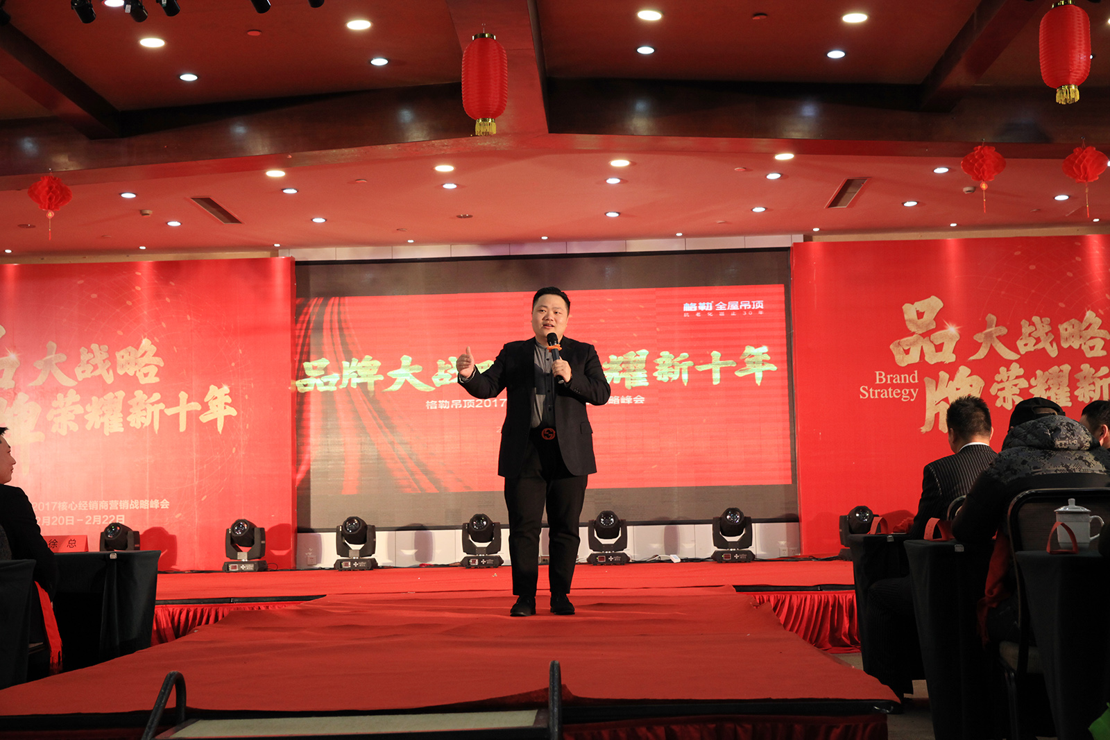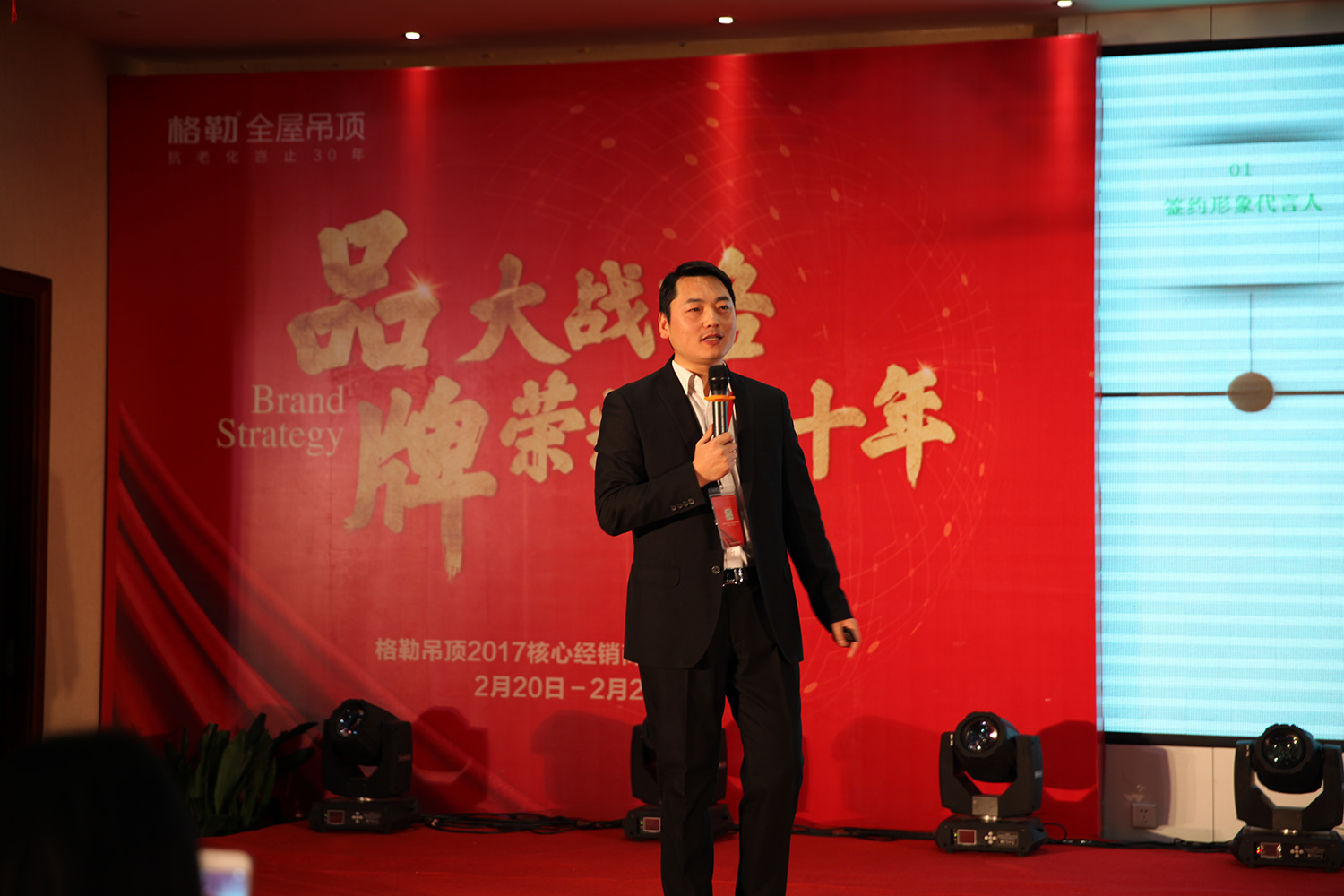 在經(jīng)銷商家人們?nèi)咳胱螅瑫?huì)議正式開(kāi)始。格勒全屋吊頂已經(jīng)發(fā)展十年,對(duì)于未來(lái)十年的發(fā)展,又是如何規(guī)劃的呢?首先,由格勒全屋吊頂總經(jīng)理徐惠峰先生上臺(tái)給大家講述2017年整體戰(zhàn)略部署。2017年,是格勒全屋吊頂?shù)摹捌放颇辍?,在品牌?zhàn)略方面有了很多的提升,包括簽約形象代言人,終端服務(wù)、培訓(xùn)細(xì)節(jié)的加大,廣告語(yǔ)和logo的提升及廣告全方位覆蓋,新增網(wǎng)點(diǎn)500家,電器產(chǎn)品“質(zhì)”的飛躍等等,正式開(kāi)啟格勒全屋吊頂“品牌大戰(zhàn)略”。